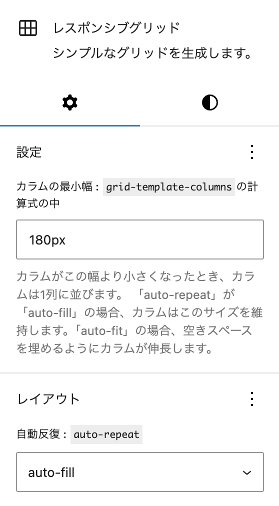 unitone の場合、これと同じ挙動をする「レスポンシブグリッド」というブロックがあるのでそれを使います。設定はこんな感じ。
