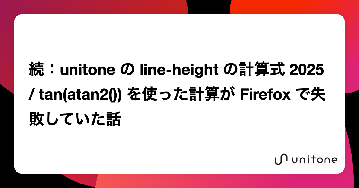 結論としては、Firefox は line-height に tan(atan2()) を使うと無効な値と判定されてしまうようで、unitone の line-height の計算式が使えないということがわかりました。そこで、Firefox の場合はフォールバックの line-height 用 CSS が適用されるように変更をおこないました。