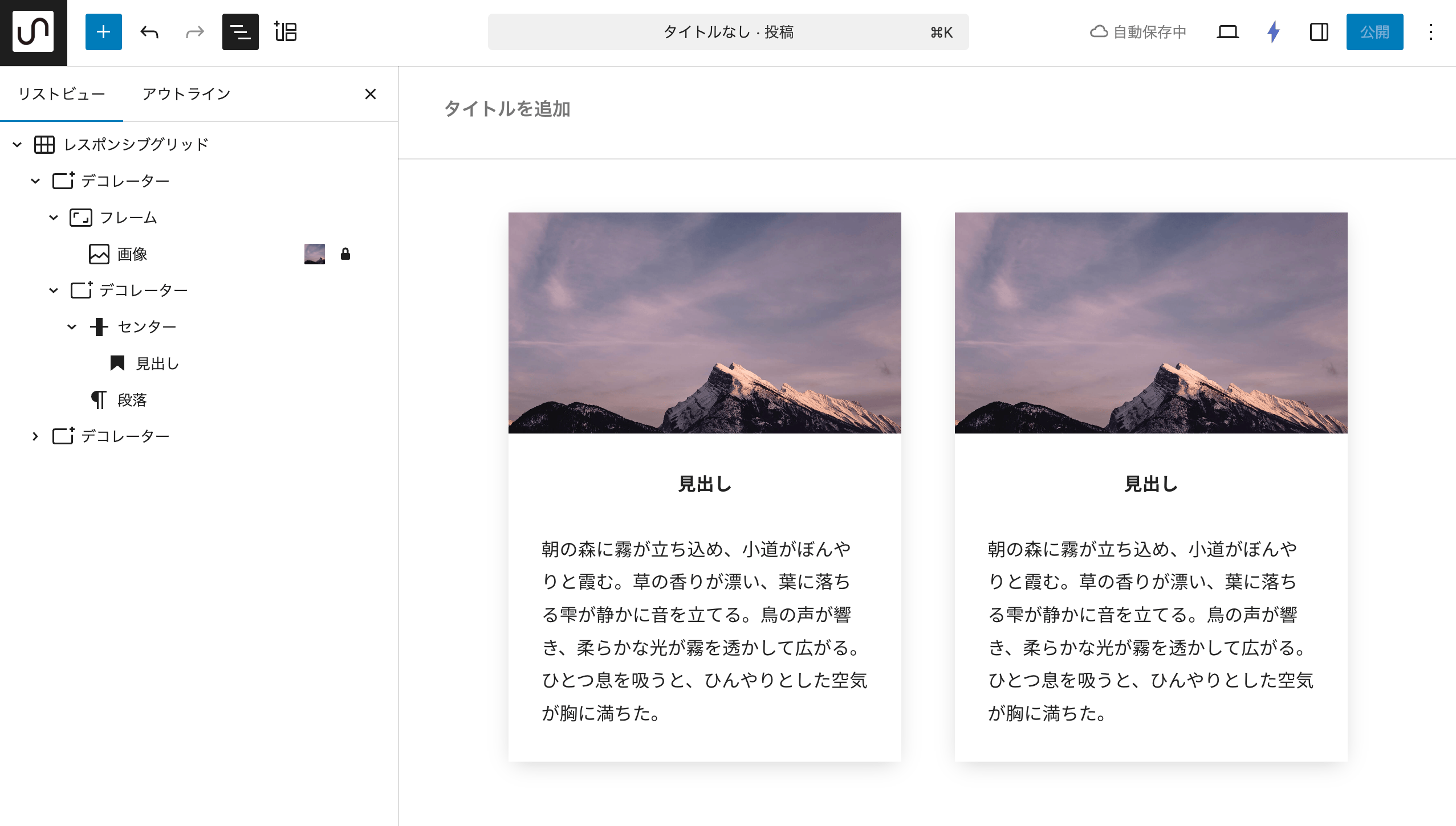 <!-- wp:unitone/responsive-grid --> <div data-unitone-layout="responsive-grid" style="--unitone--column-min-width:240px"> <!-- wp:unitone/decorator {"style":{"shadow":"var:preset|shadow|unitone-natural"}} --> <div data-unitone-layout="decorator" style="box-shadow:var(--wp--preset--shadow--unitone-natural)"> <!-- wp:unitone/frame --> <div data-unitone-layout="frame" style="--unitone--ratio:16/9"> <!-- wp:image {"id":1,"lock":{"move":true,"remove":true}} --> <figure class="wp-block-image"><img src="https://unitone.2inc.org/wp-content/themes/unitone/dist/img/stocksnap_lgg8nat9jy.jpg" alt="" class="wp-image-1"/></figure> <!-- /wp:image --> </div> <!-- /wp:unitone/frame --> <!-- wp:unitone/decorator {"unitone":{"position":{"position":"relative"},"overflow":"visible","padding":"1","gap":"1"}} --> <div data-unitone-layout="decorator"> <!-- wp:unitone/center --> <div data-unitone-layout="center"> <!-- wp:heading {"level":3} --> <h3 class="wp-block-heading">見出し</h3> <!-- /wp:heading --> </div> <!-- /wp:unitone/center --> <!-- wp:paragraph --> <p>朝の森に霧が立ち込め、小道がぼんやりと霞む。草の香りが漂い、葉に落ちる雫が静かに音を立てる。鳥の声が響き、柔らかな光が霧を透かして広がる。ひとつ息を吸うと、ひんやりとした空気が胸に満ちた。</p> <!-- /wp:paragraph --> </div> <!-- /wp:unitone/decorator --> </div> <!-- /wp:unitone/decorator --> <!-- wp:unitone/decorator {"style":{"shadow":"var:preset|shadow|unitone-natural"}} --> <div data-unitone-layout="decorator" style="box-shadow:var(--wp--preset--shadow--unitone-natural)"> <!-- wp:unitone/frame --> <div data-unitone-layout="frame" style="--unitone--ratio:16/9"> <!-- wp:image {"id":1,"lock":{"move":true,"remove":true}} --> <figure class="wp-block-image"><img src="https://unitone.2inc.org/wp-content/themes/unitone/dist/img/stocksnap_lgg8nat9jy.jpg" alt="" class="wp-image-1"/></figure> <!-- /wp:image --> </div> <!-- /wp:unitone/frame --> <!-- wp:unitone/decorator {"unitone":{"position":{"position":"relative"},"overflow":"visible","padding":"1","gap":"1"}} --> <div data-unitone-layout="decorator"> <!-- wp:unitone/center --> <div data-unitone-layout="center"> <!-- wp:heading {"level":3} --> <h3 class="wp-block-heading">見出し</h3> <!-- /wp:heading --> </div> <!-- /wp:unitone/center --> <!-- wp:paragraph --> <p>朝の森に霧が立ち込め、小道がぼんやりと霞む。草の香りが漂い、葉に落ちる雫が静かに音を立てる。鳥の声が響き、柔らかな光が霧を透かして広がる。ひとつ息を吸うと、ひんやりとした空気が胸に満ちた。</p> <!-- /wp:paragraph --> </div> <!-- /wp:unitone/decorator --> </div> <!-- /wp:unitone/decorator --> </div> <!-- /wp:unitone/responsive-grid -->