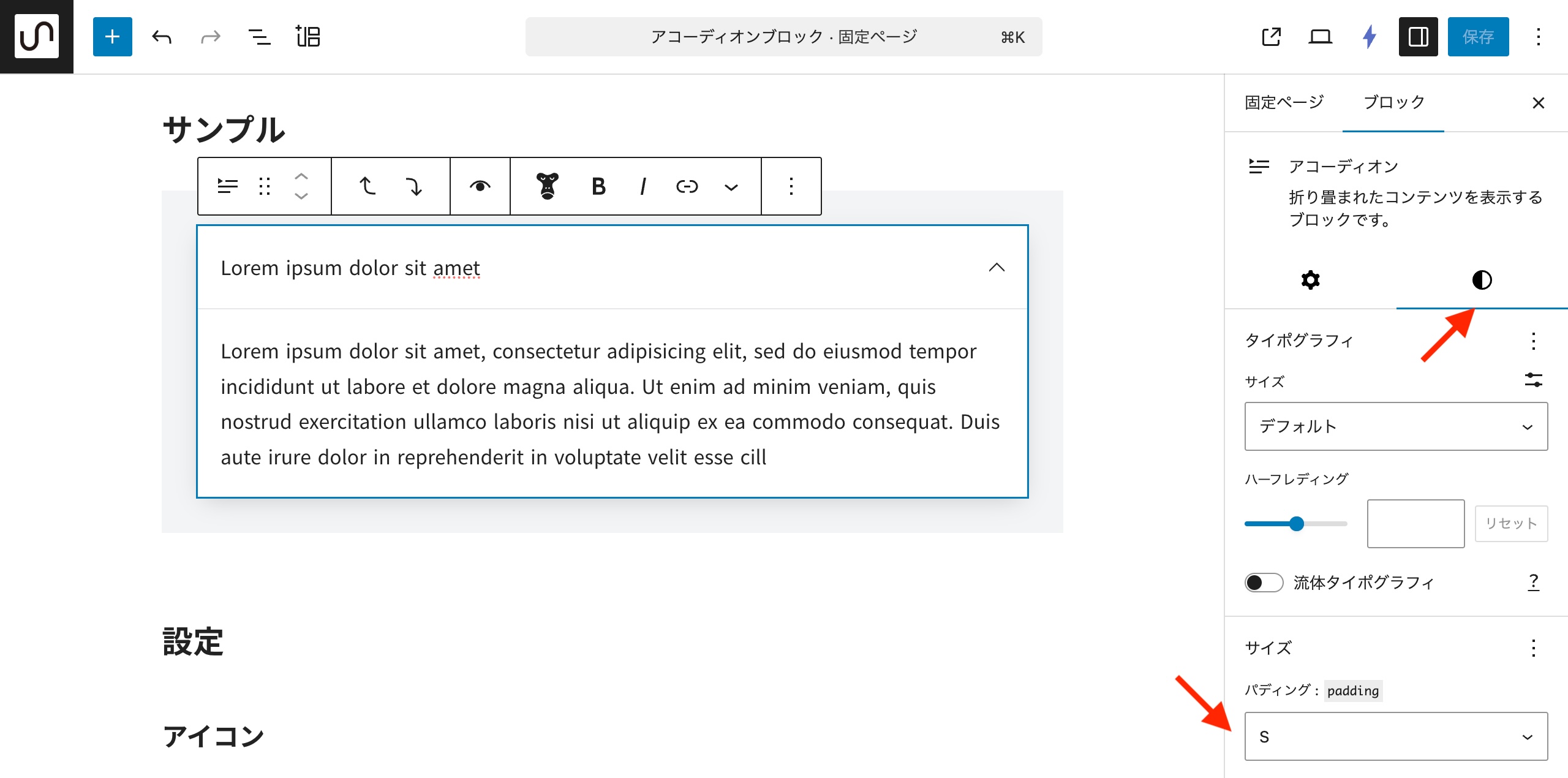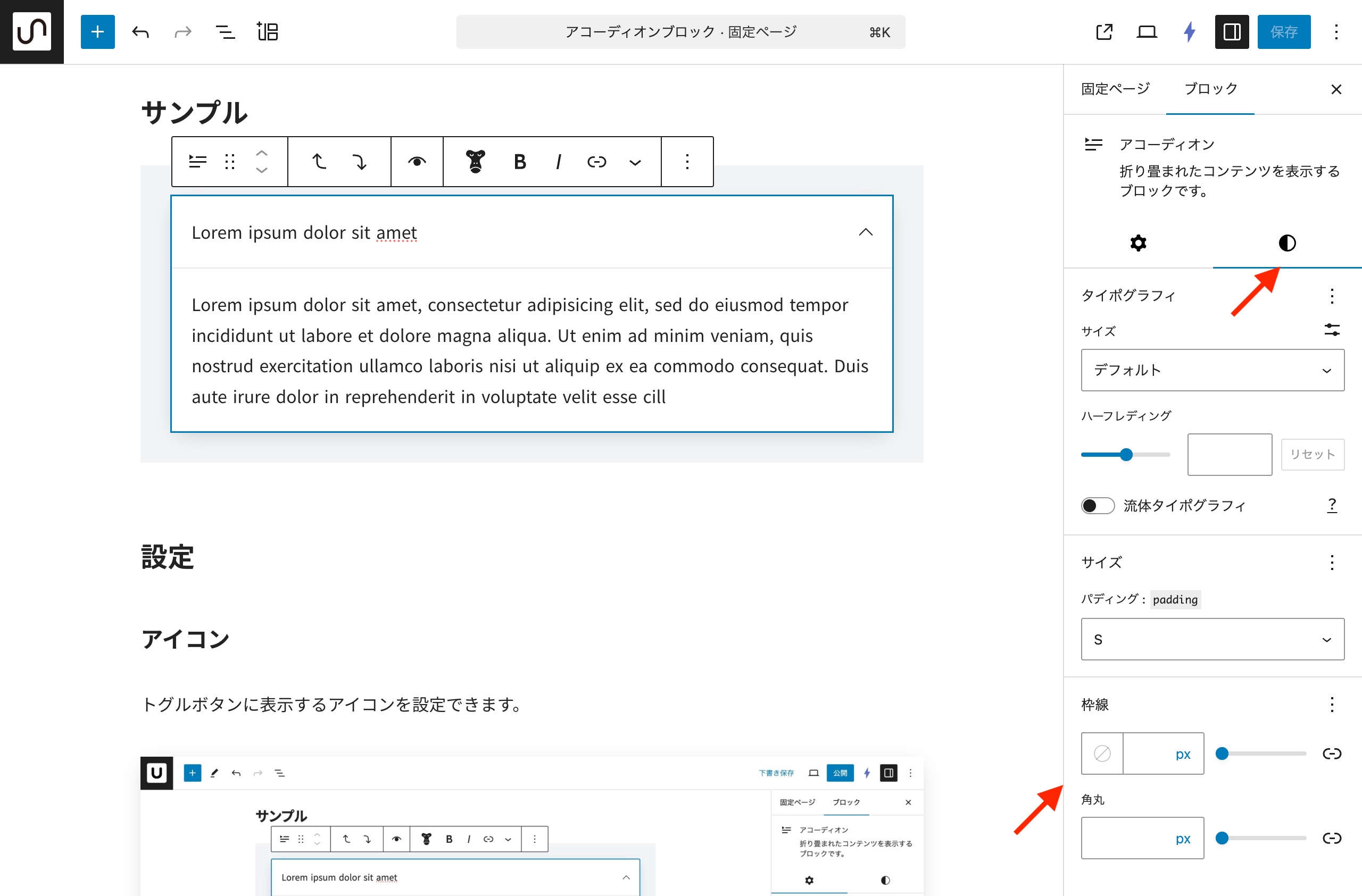 トグルボタンをクリックすると展開するアコーディオンを表示するブロックです。