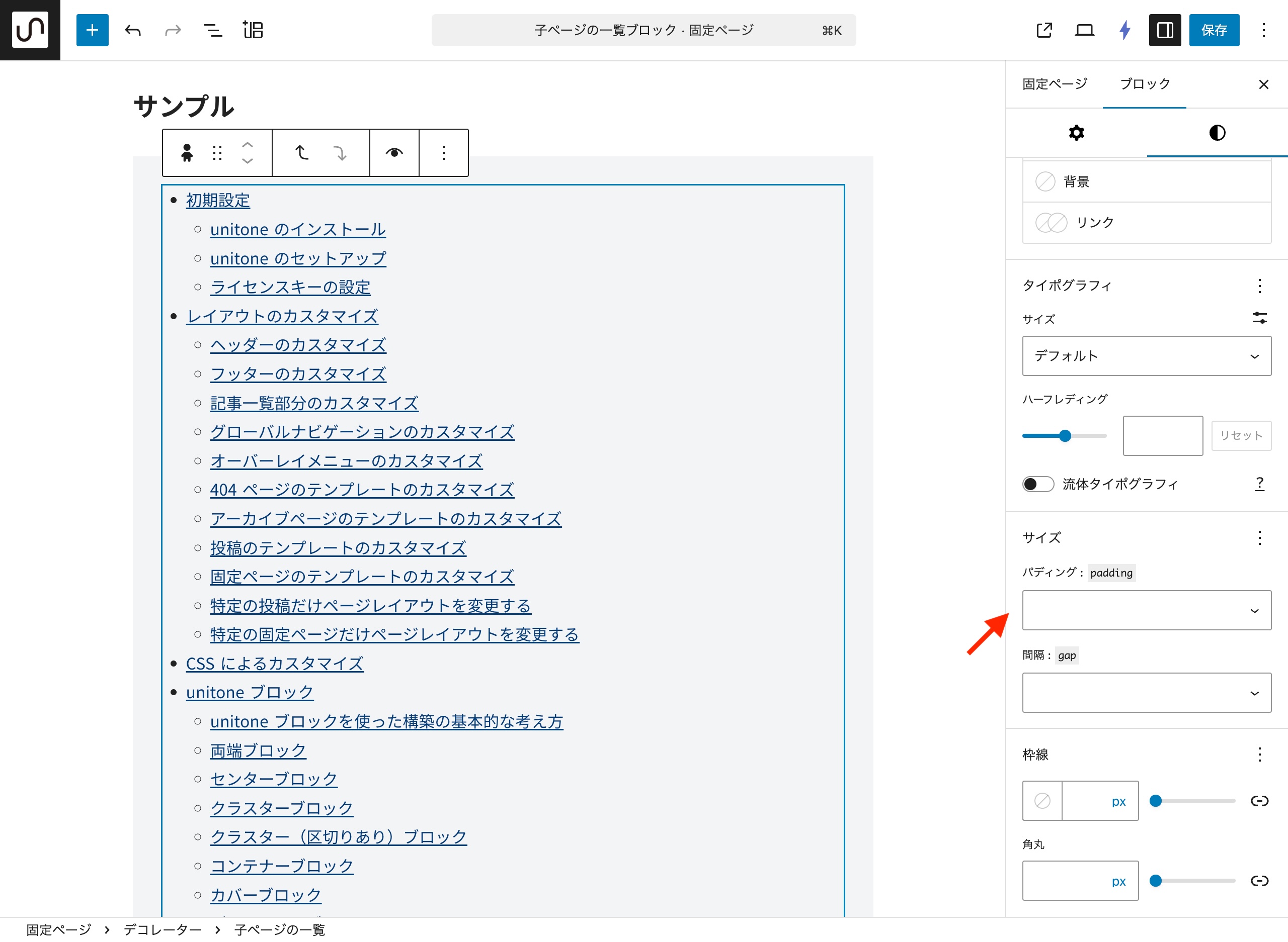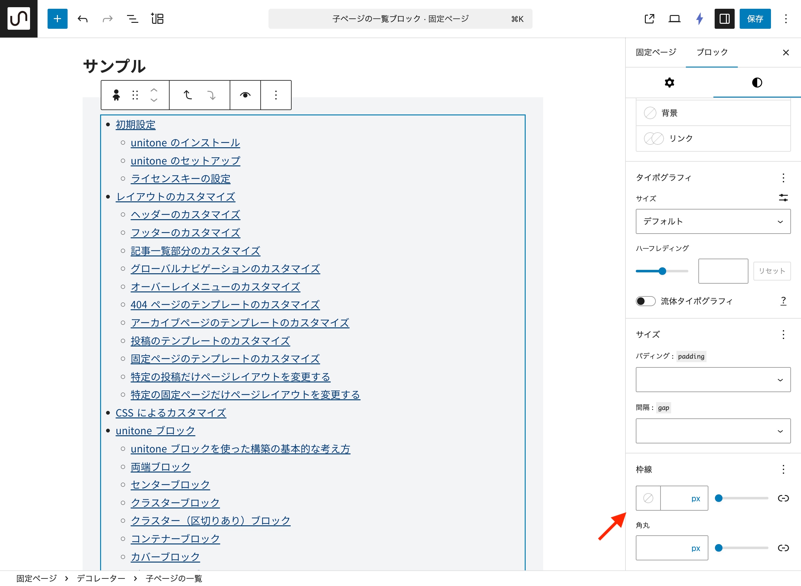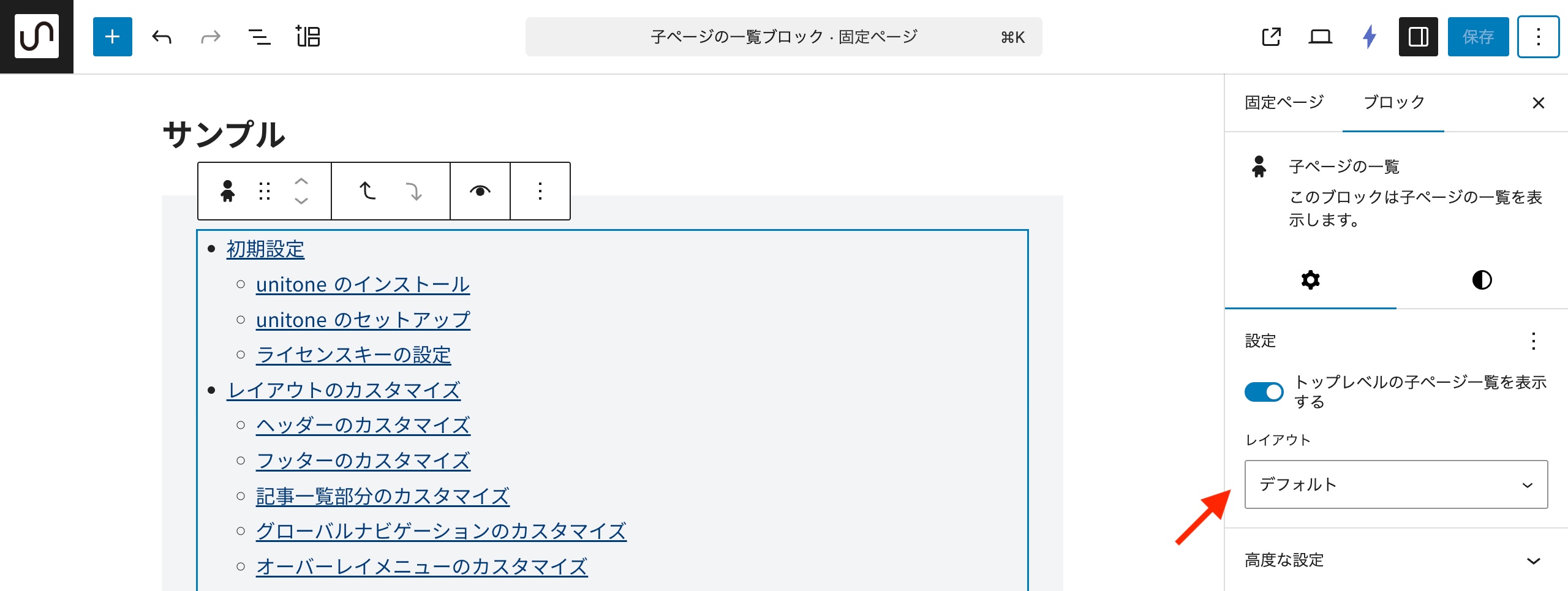 「トップレベルの子ページ一覧を表示する」が無効の場合に設定できます。