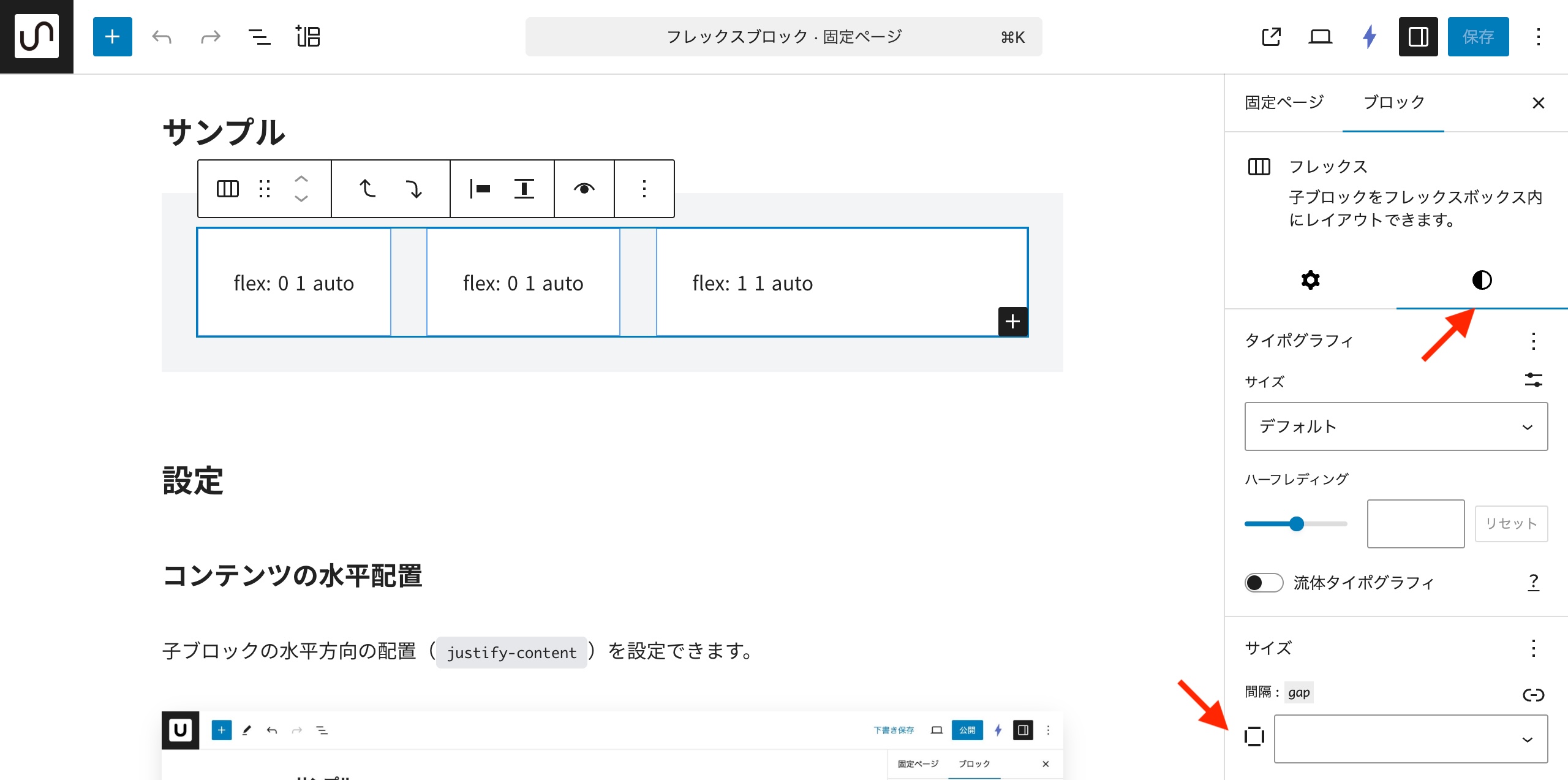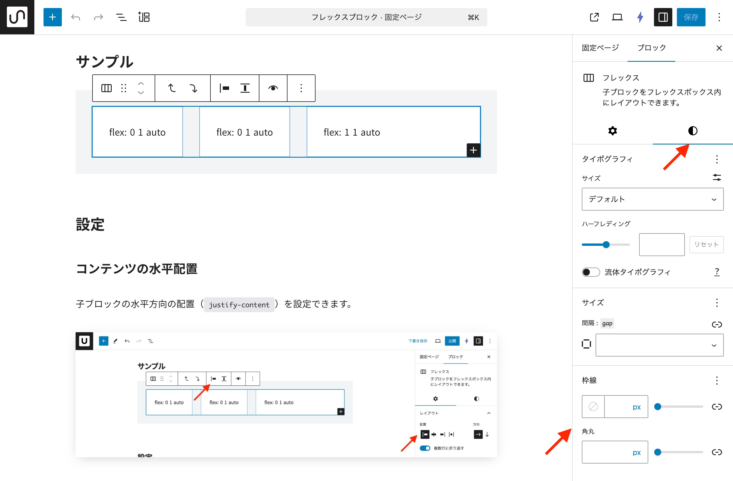 フレックスブロックの子ブロックには flex-grow、flex-shrink、flex-basis の設定が追加されます。
