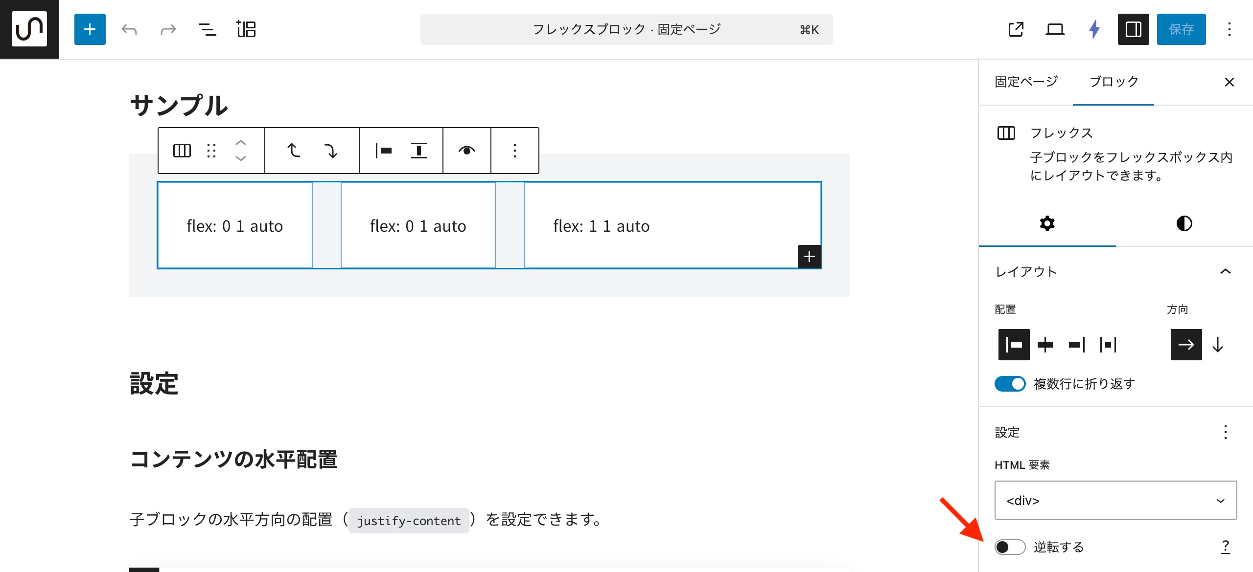 子ブロックを1行に押し込むか複数行に折り返すかを設定できます。