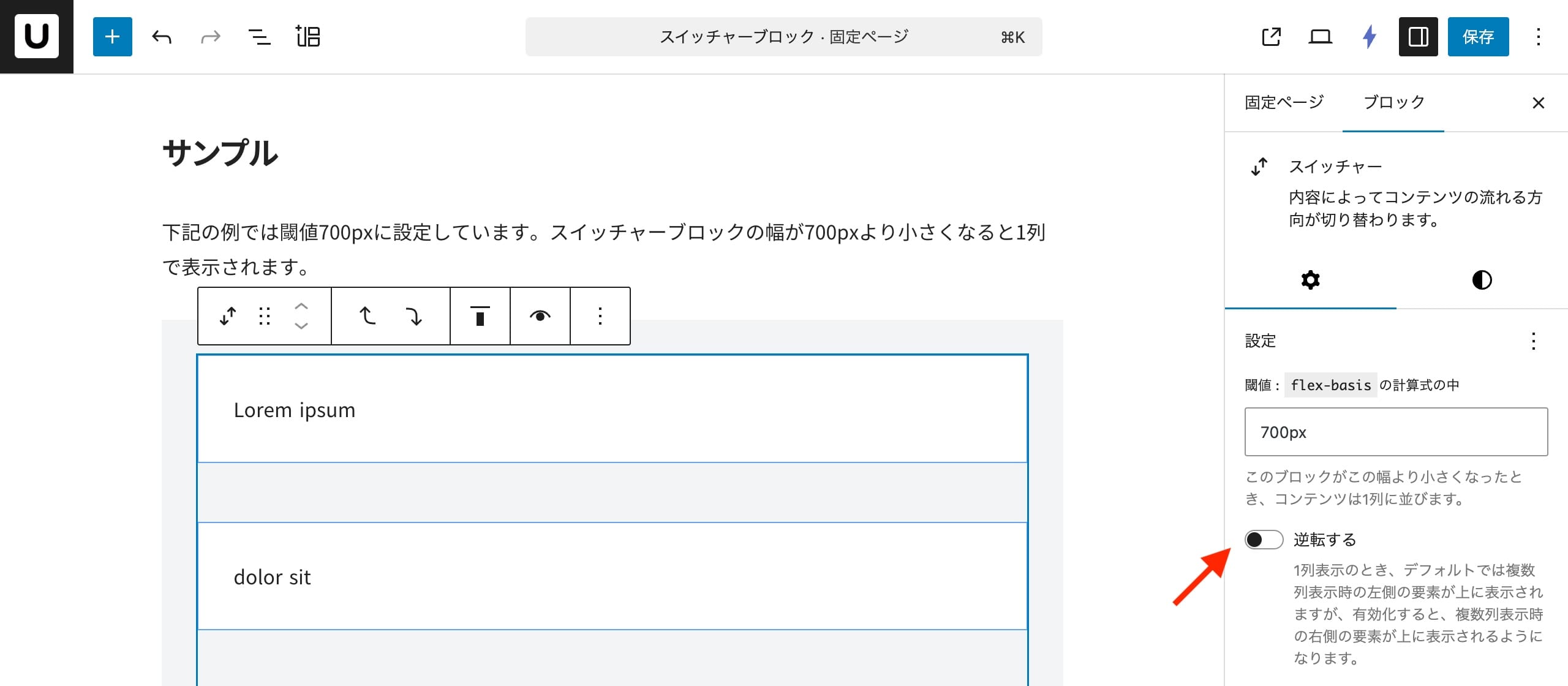 下記の例では閾値700pxに設定しています。スイッチャーブロックの幅が700pxより小さくなると1列で表示されます。