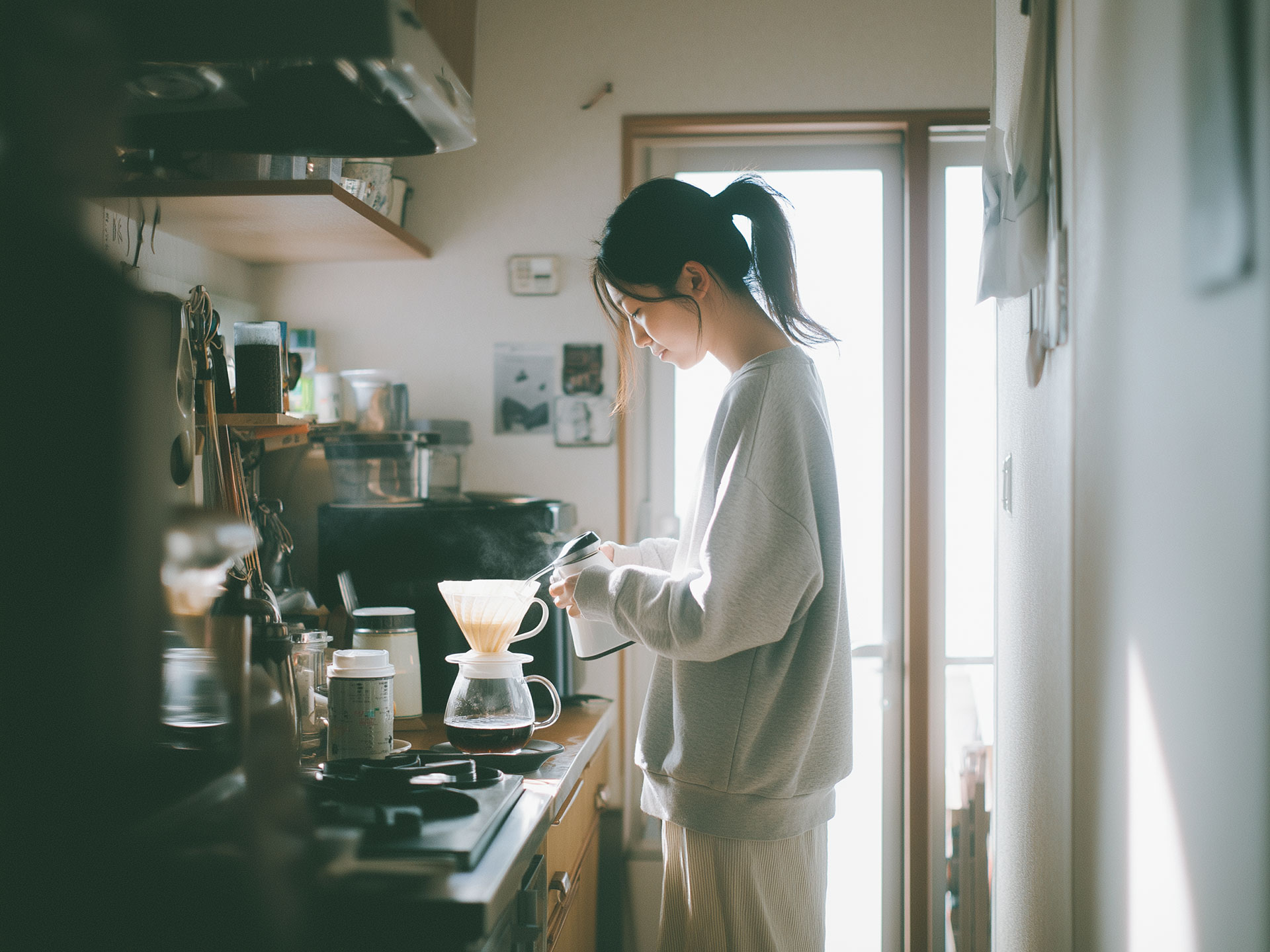 待ち合わせの時間まであと十分。歩道の向こう、彼女が歩いてくるのが見えた。今日はただ、一緒に散歩するだけ。でも、それがたまらなく特別なことのように思えた。朝の空気が少し冷たくなった。色づき始めた木の葉が揺れている。赤い葉がひらりと落ちてきた。夏が終わり、新しい季節がやってくる。あたたかい飲み物が恋しくなって、近くのカフェへと足を向けた。